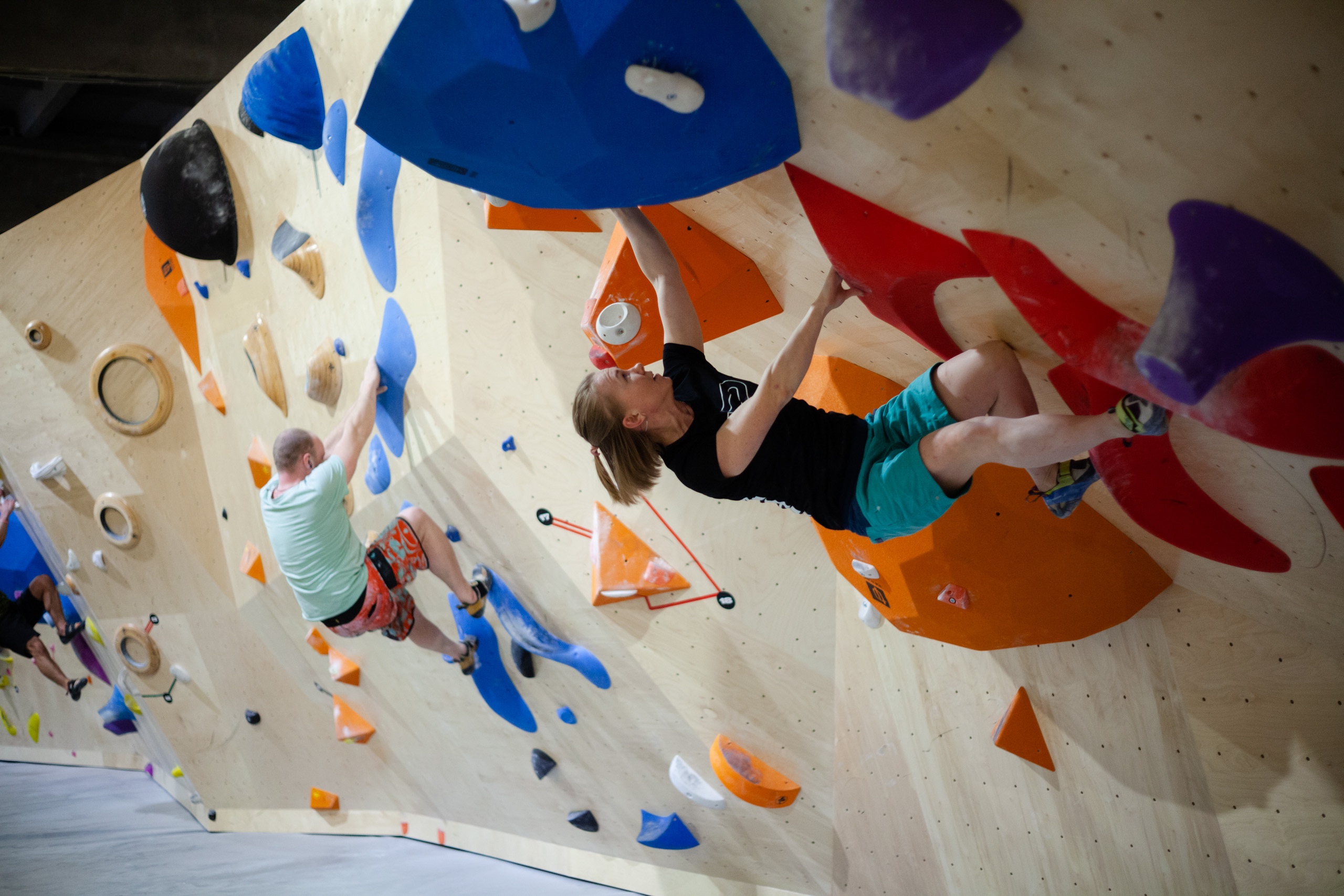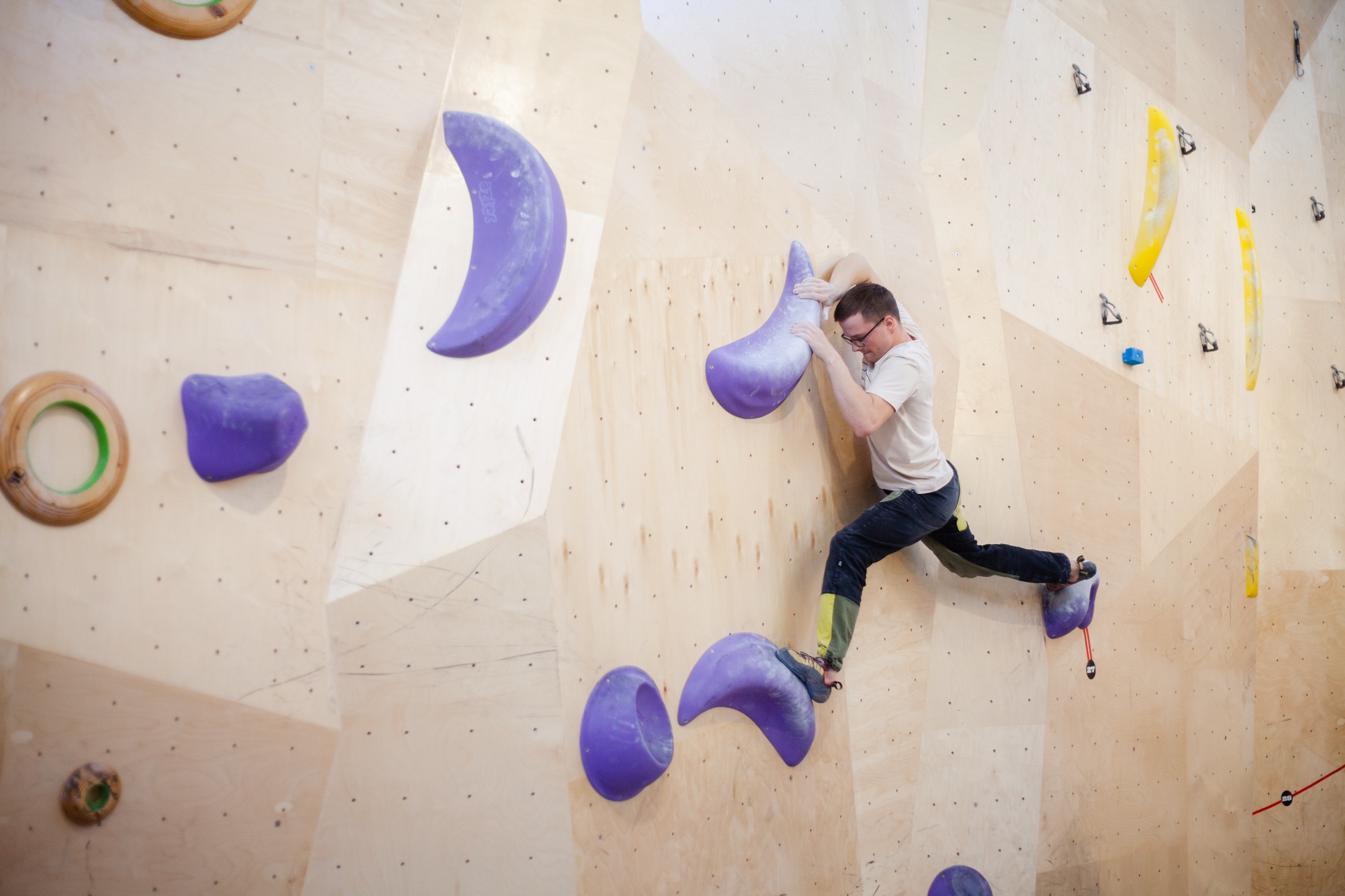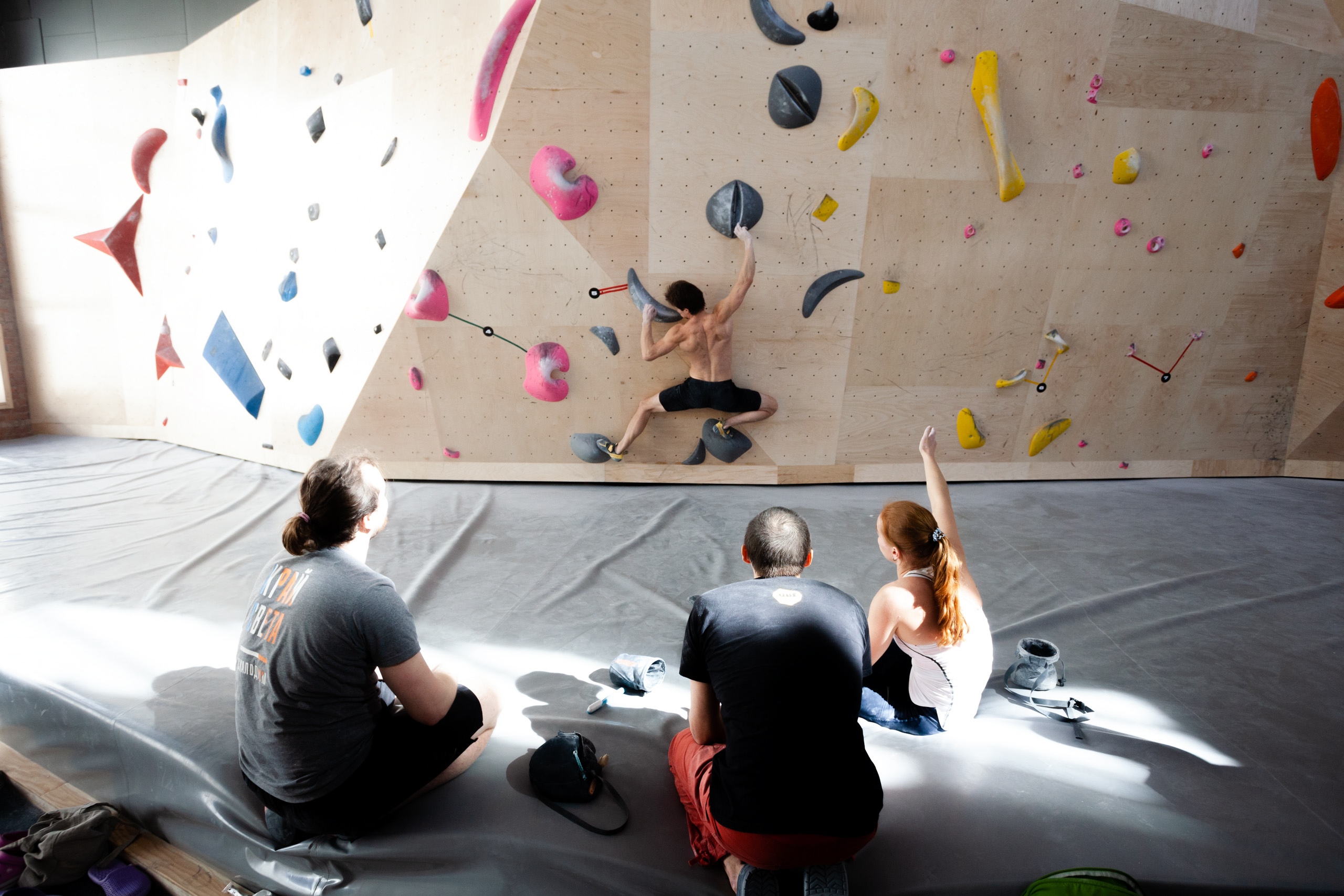 Болдеринг — это прохождение технически сложных трасс высотой от 3 до 5 метров. Здесь развивается как физическая форма: сила, выносливость, координация и равновесие, так и интеллект: внимательность, память и пространственное мышление.